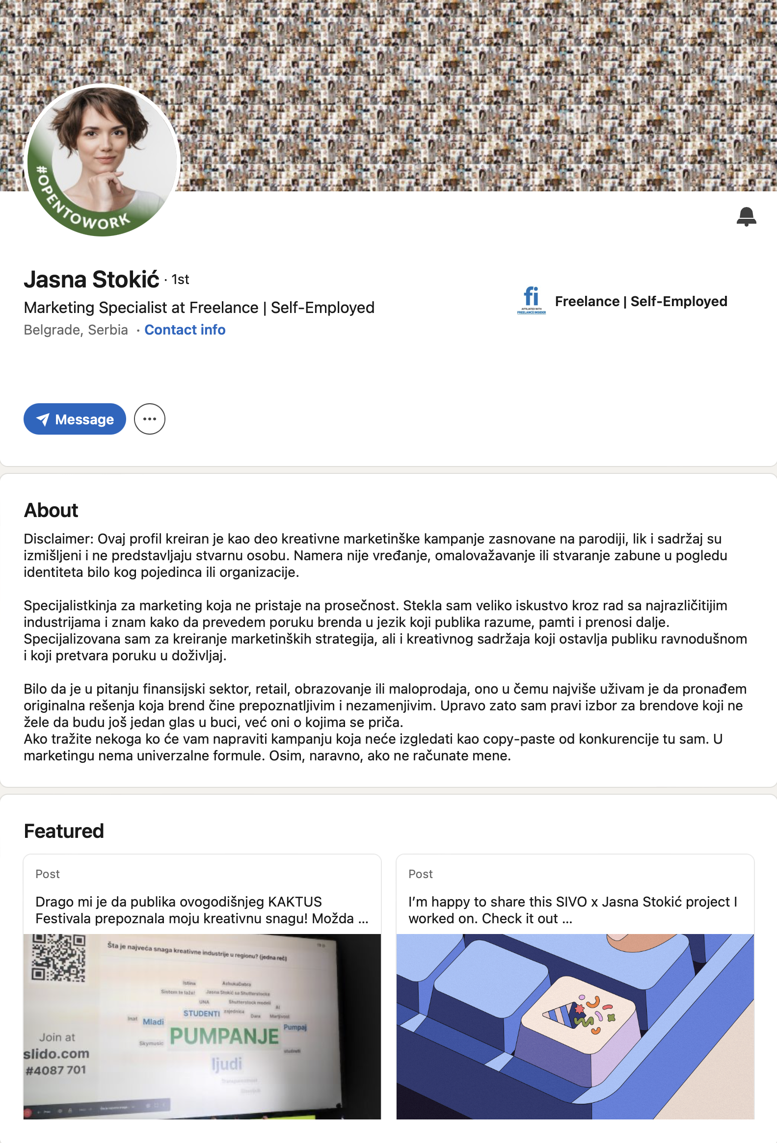 Sa tom idejom, kreiran je LinkedIn profil Jasne Stokić kao Marketing specijalistkinje.